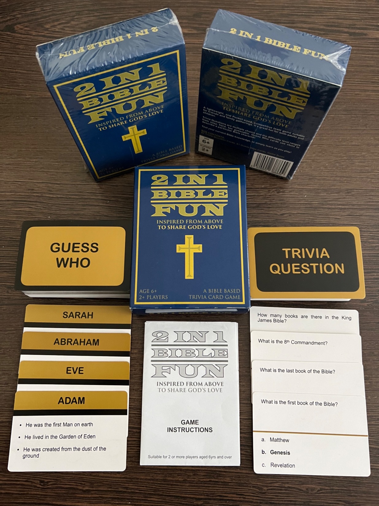 2 IN 1 BIBLE FUN is a Bible Based Trivia Card Game. Regardless of how much, or even how little, you currently know about the bible, you can either test your current knowledge, or learn as you play! 2 IN 1 BIBLE FUN is a competitive game, suitable for friend or family gatherings, and is great fun for both adults and children.